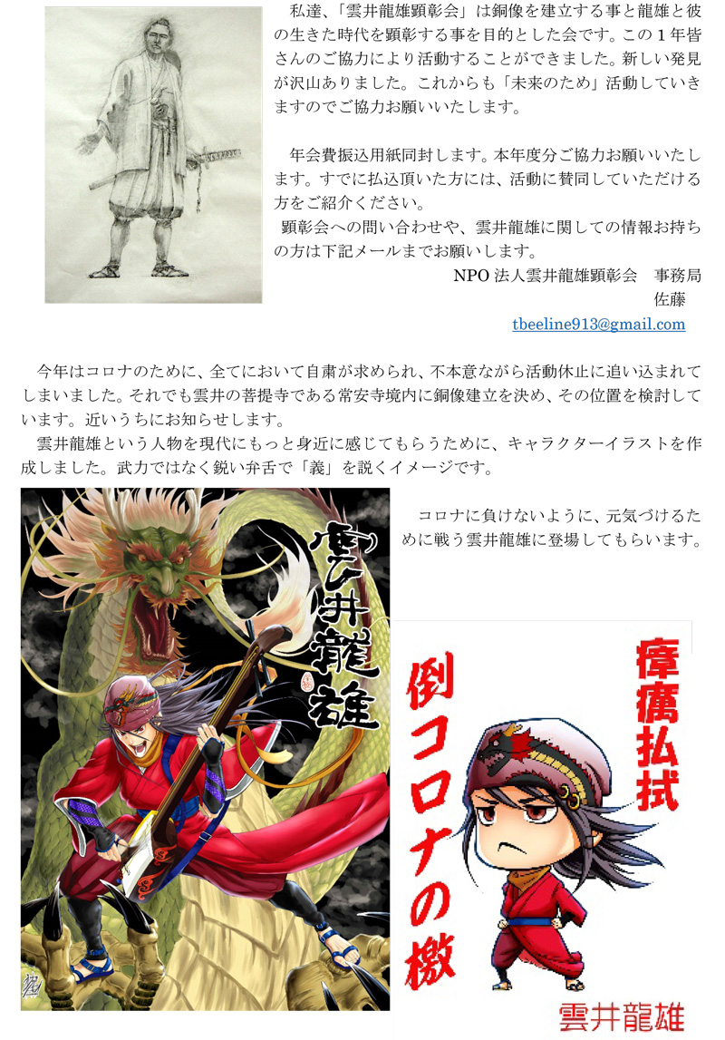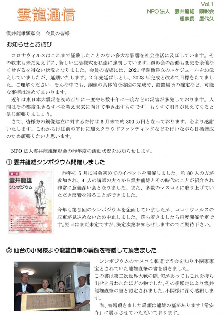 Home 新着情報, 雲龍通信 雲龍通信Vol.1 雲龍通信Vol.1 2020.11.12 新着情報、雲龍通信 Vol.1ダウンロードはこちら(PDF2.6M)← Post Share Hatena RSS Pin it コメントは利用できません。